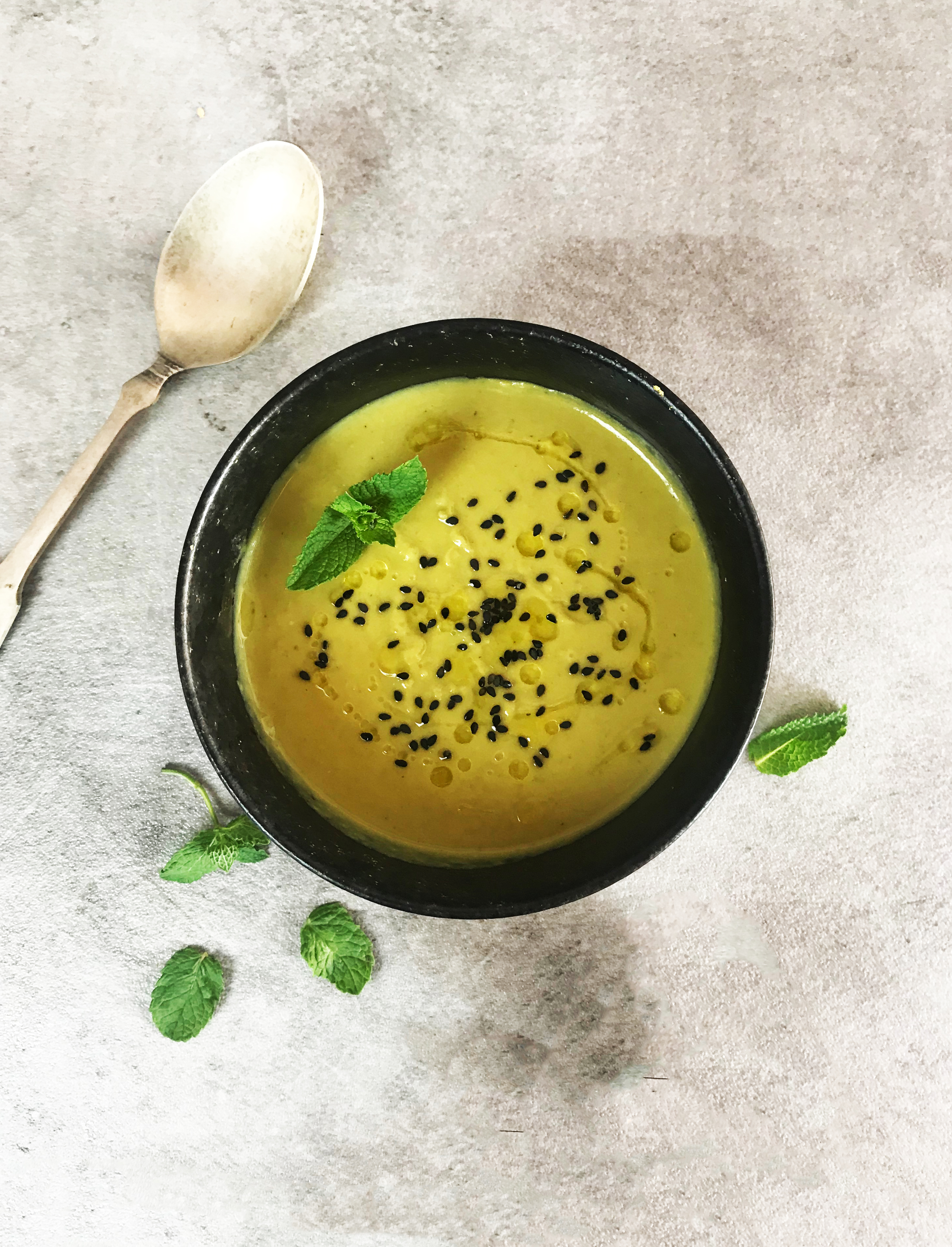 2. Mientras cortamos el calabacín y la patata a medias lunas. Lo añadimos a la olla junto al diente de ajo, el jengibre y el agua o caldo de verduras. Cocinar a fuego medio unos 10-15 minutos hasta que las verduras estén tiernas.