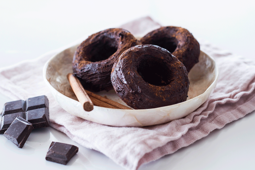 - Deshacer el chocolate al baño maría junto a una cucharada de aceite de coco. Moja los donuts y añade un poco de canela en polvo por encima.
