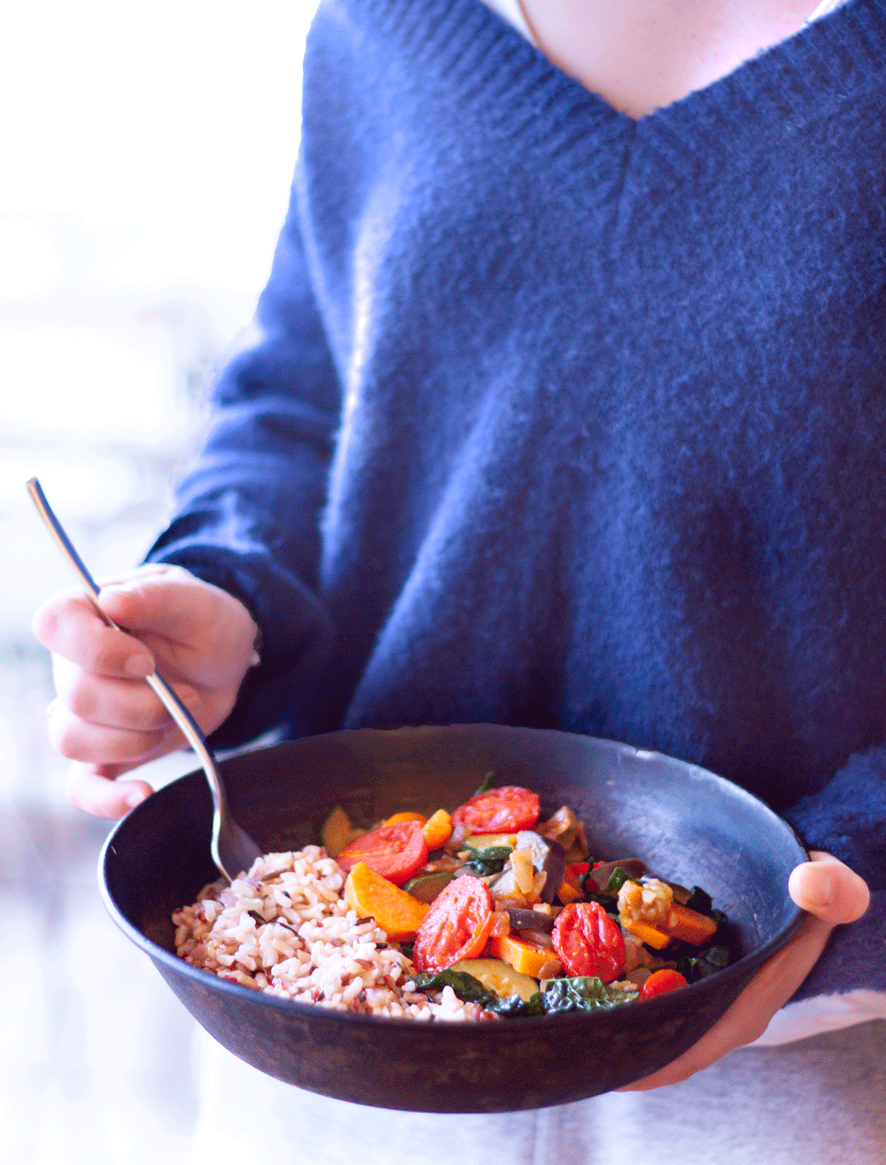 - Servir las verduras junto al arroz y los tomates cherry salteados por encima.