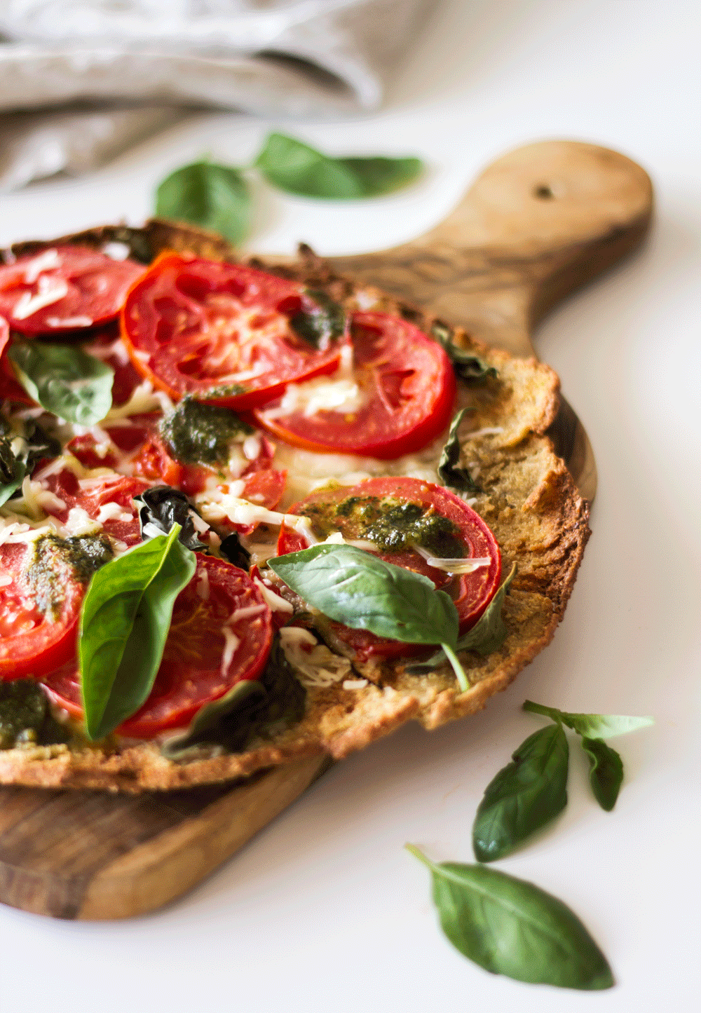 7. Dar la vuelta a la pizza y añadir todos los ingredientes (menos el pesto) por encima.