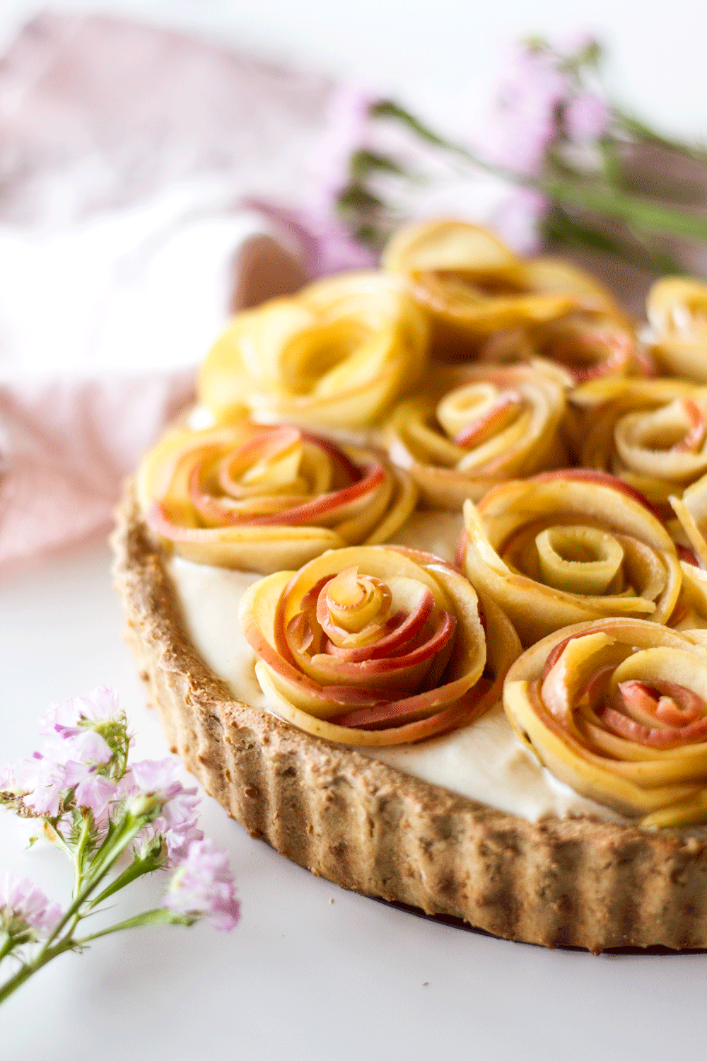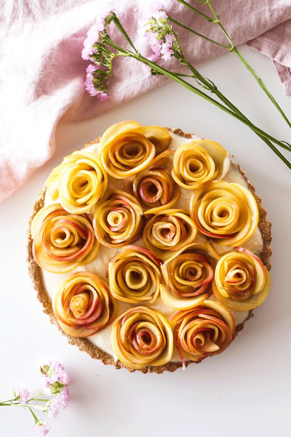 - Para hacer las rosas enroscaremos cada uno de los trozos de manzana uno encima del otro, de manera que vamos creando la rosa.