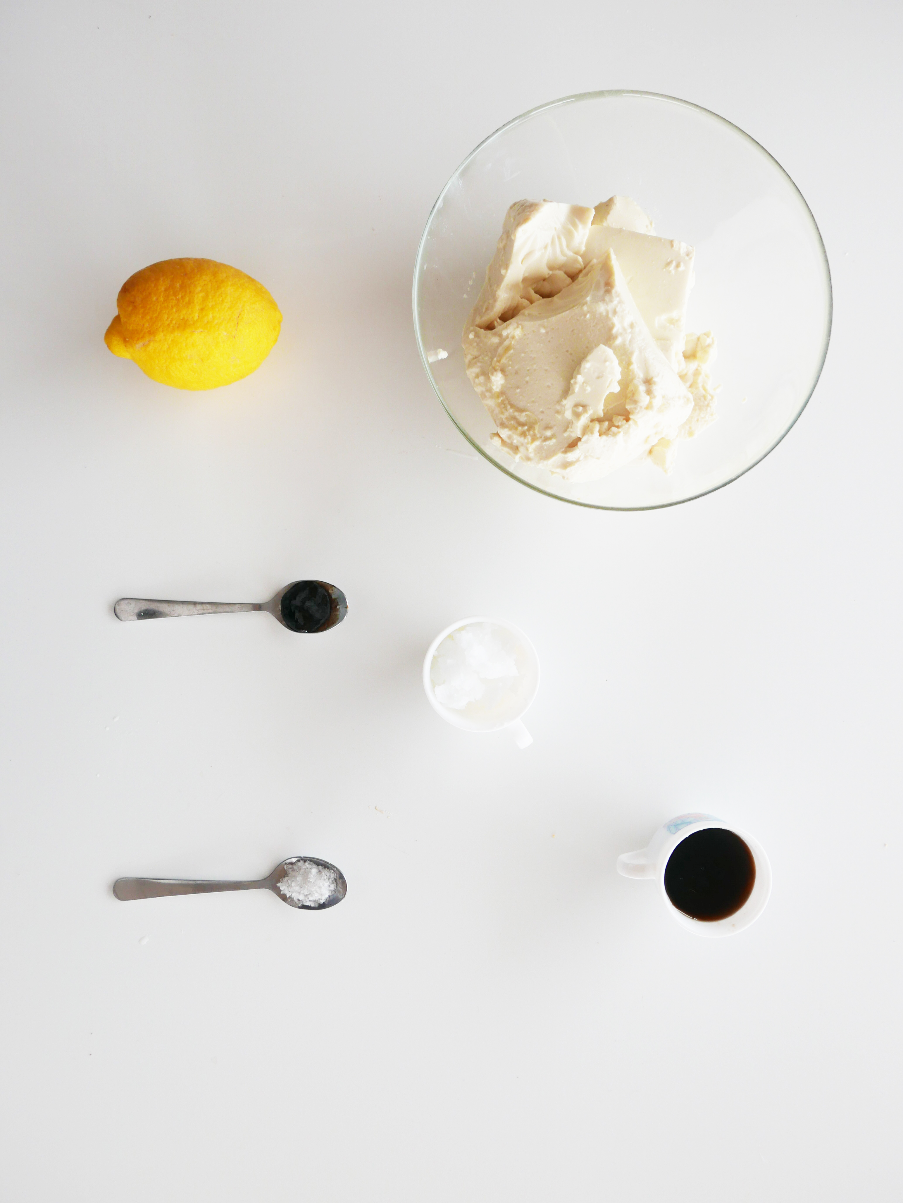 - Mezclaremos todos los ingredientes (tofu, aceite de coco, zumo de limón, ralladura, sirope de agave, vainilla y sal) y los batiremos con un procesador de alimentos o batidora.
