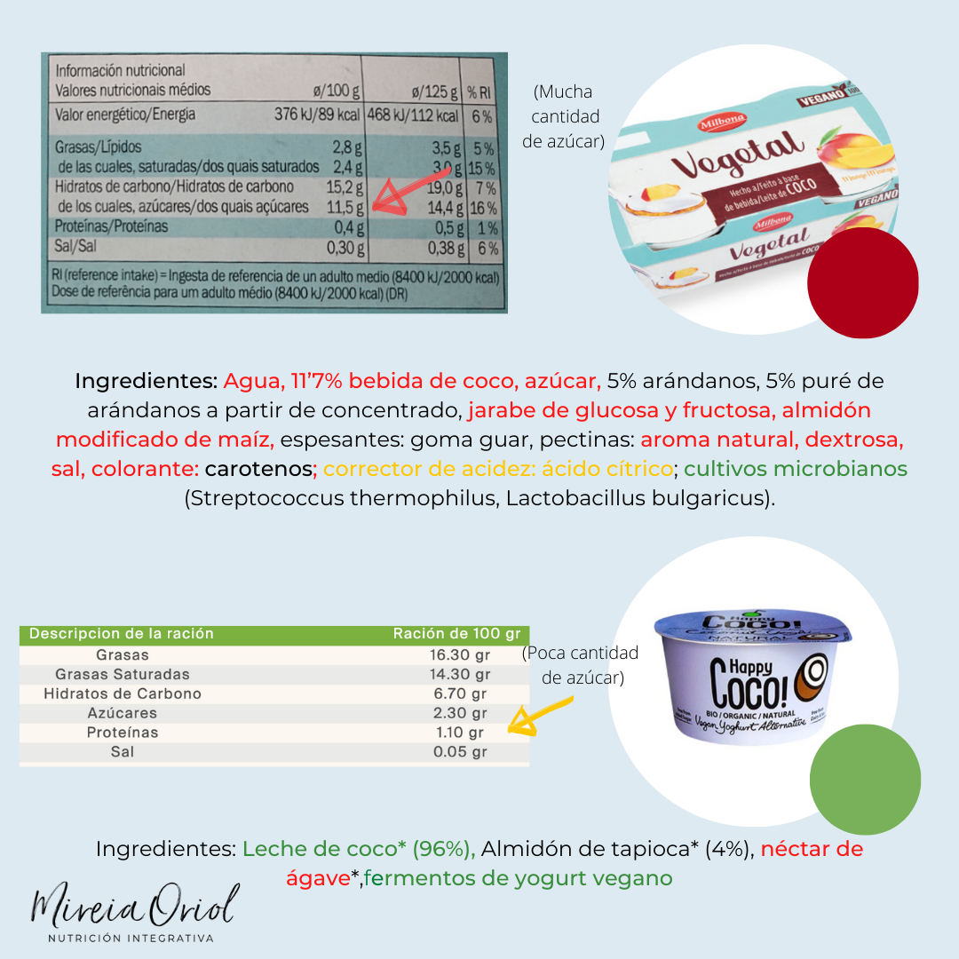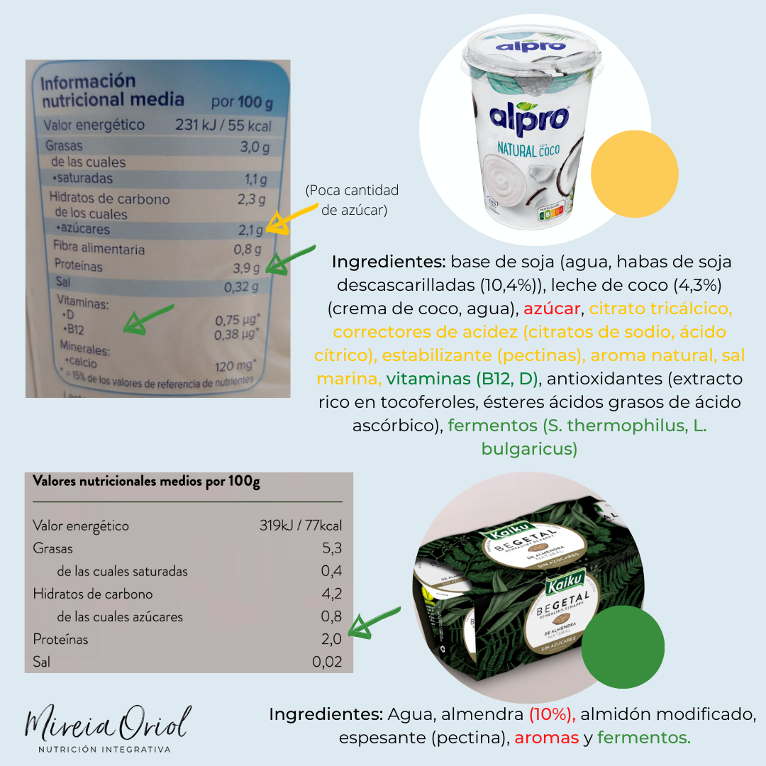 Los yogures vegetales pueden ser una buena opción para introducir en una dieta vegana o vegetariana, ya que suelen ser ricos en proteínas. Pero cómo en todos los procesados encontramos distintas calidades y composiciones y no todos ellos son saludables.  La clave para elegir bien siempre está en la etiqueta.