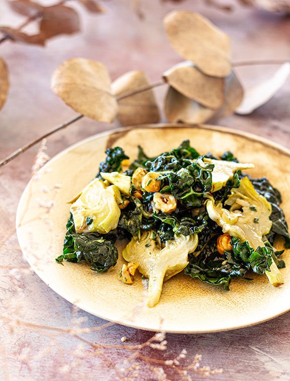 Ensalada de col kale, alcachofas y avellanas con aliño de menta
