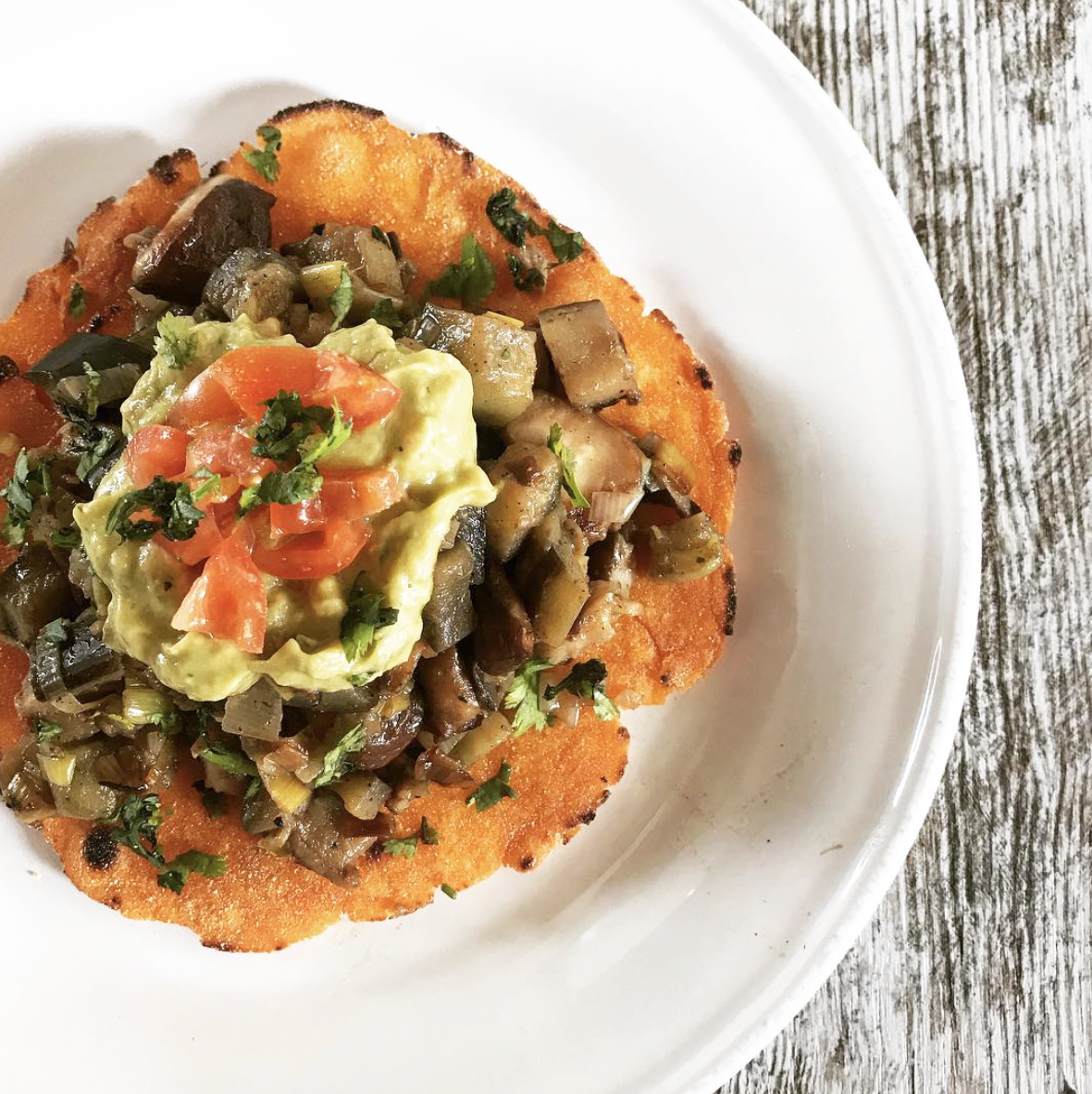 5. Para el relleno saltea las verduras y las setas a la sartén junto a especias al gusto y una pizca de sal. Machaca un poco de aguacate y corta un poco de tomate fresco crudo para poner por encima.