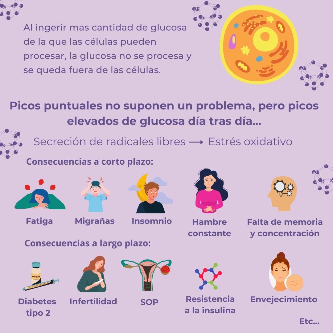 Un pico puntual nuestro cuerpo lo puede gestionar, pero picos muy elevados día tras día van a suponer un aumento del estrés oxidativo causado por los radicales libres (moléculas muy reactivas que desestabilizan a otras). En la infografía podéis ver consecuencias a corto y largo plazo sobre la salud y 7 consejos fáciles de aplicar a tu día a día para controlar estos picos de glucosa y mejorar tu salud.