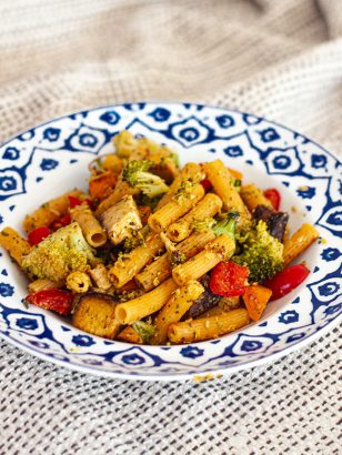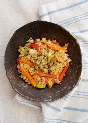 Ingredientes: 1 coliflor 1 Puerro o 1 cebolla 1 pimiento rojo 1 calabacín 1 ajo picado sin germen Aceite de oliva Para la salsa: 2 cucharadas de crema de cacahuete 2 cucharadas salsa de tamari o salsa de soja 1 cucharada de vinagre de manzana 1 pizca de jengibre en polvo Preparación: