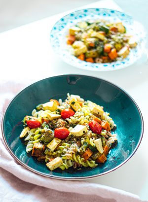 Ingredientes: Espirales de arroz Zanahoria cortado al estilo brunoise (a dados) Puerro cortado al estilo brunoise Calabacín cortado al estilo brunoise (a dados) Tofu cortado a dados Tomates cherry Pisca de sal Aceite de oliva virgen extra Nuez moscada Hiervas provenzales Pimienta negra Levadura nutricional Preparación: 1.Hervir la pasta según las indicaciones